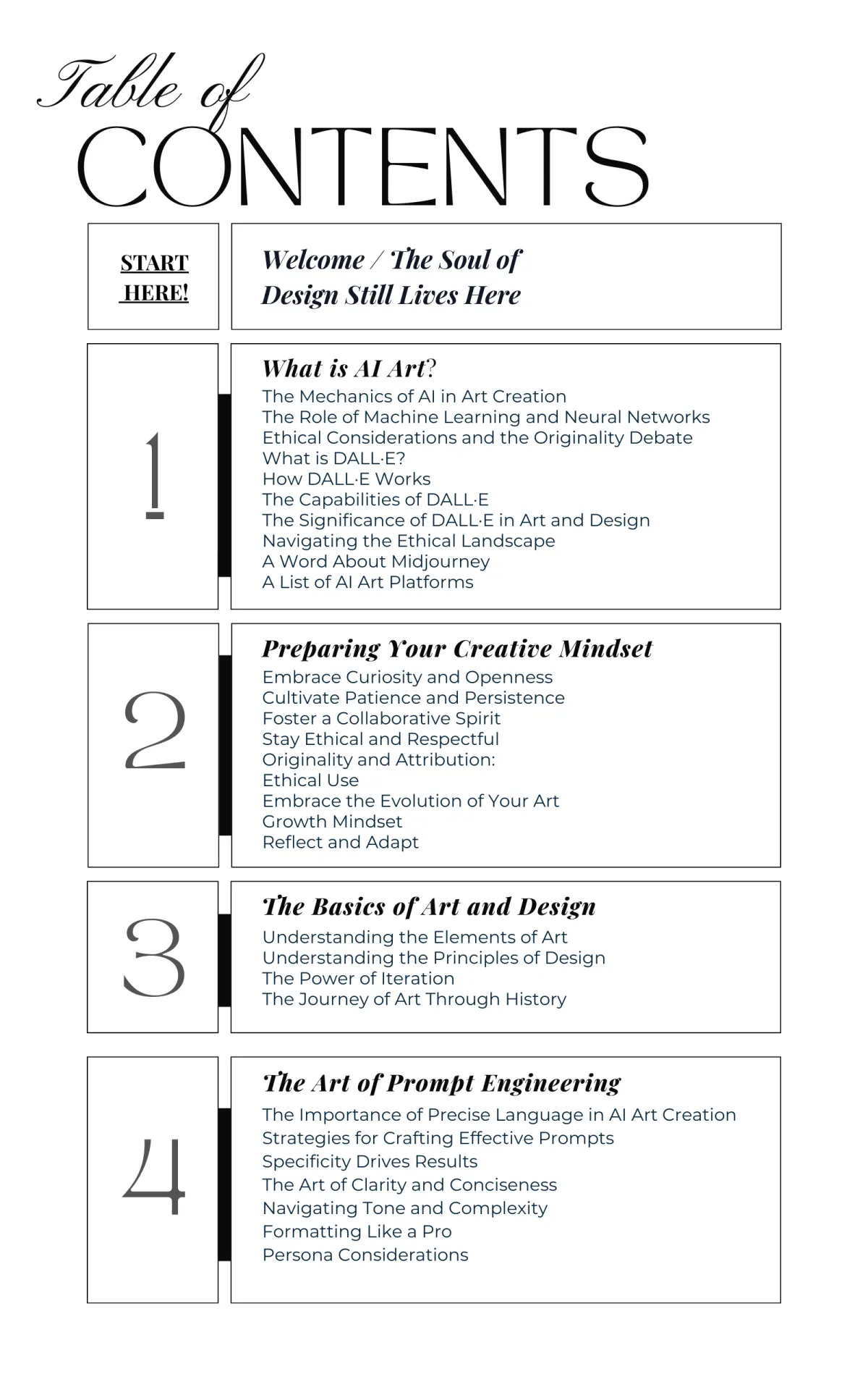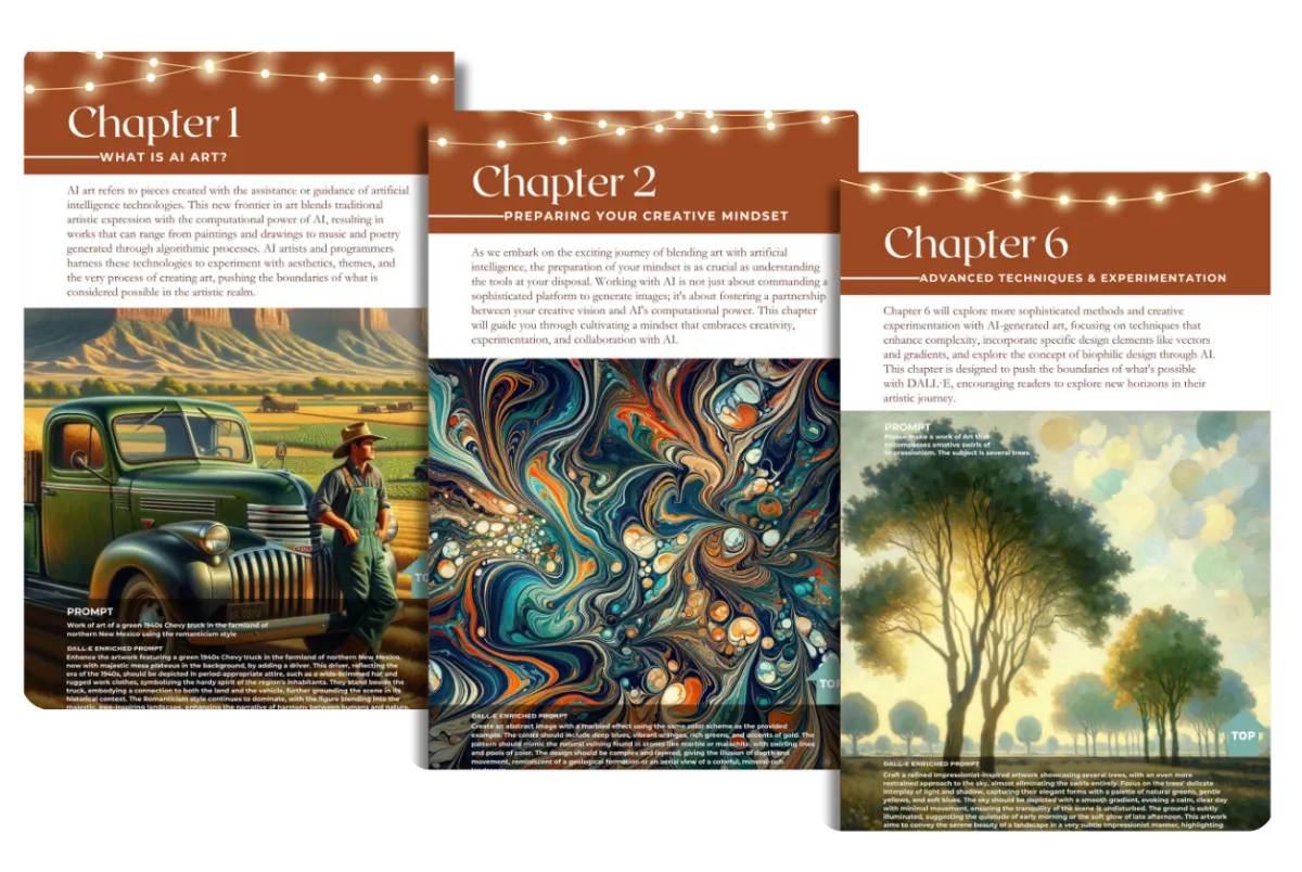 To get the most out of it, start by reading through the core chapters in order, from foundational concepts like "What is AI Art?" to advanced topics like prompt engineering and turning digital pieces into physical prints. Use the included prompts, design principles, and project ideas as a hands-on reference while creating, and revisit specific chapters whenever you need visual inspiration or artistic clarity. Think of this eBook not just as a read, but as a creative companion to elevate your artistic process every step of the way.