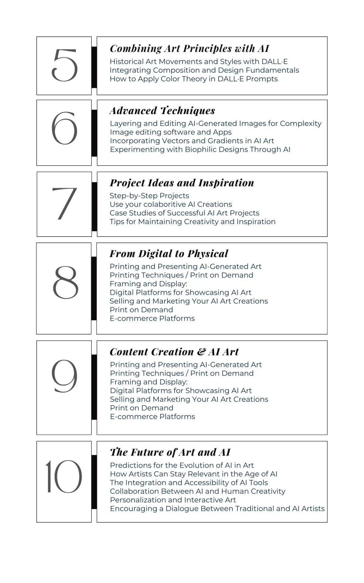 A 6-module program that teaches you to design prompts with an artist’s eye—using elements & principles of design to achieve consistent, signature-style results.